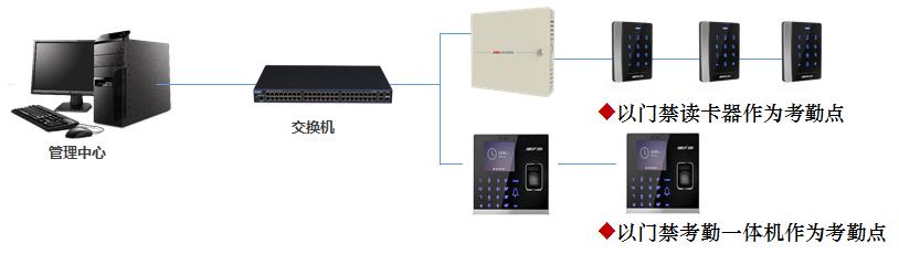 考勤管理系統(tǒng)通過綜合管理平臺實現(xiàn)與數(shù)據(jù)庫的數(shù)據(jù)交互,包括人員資料、卡片資料、刷卡數(shù)據(jù)等多種資料。硬件的設(shè)置、權(quán)限的發(fā)放以及人員的卡片發(fā)放等由綜合管理平臺統(tǒng)一完成。系統(tǒng)的架構(gòu)如下圖所示: